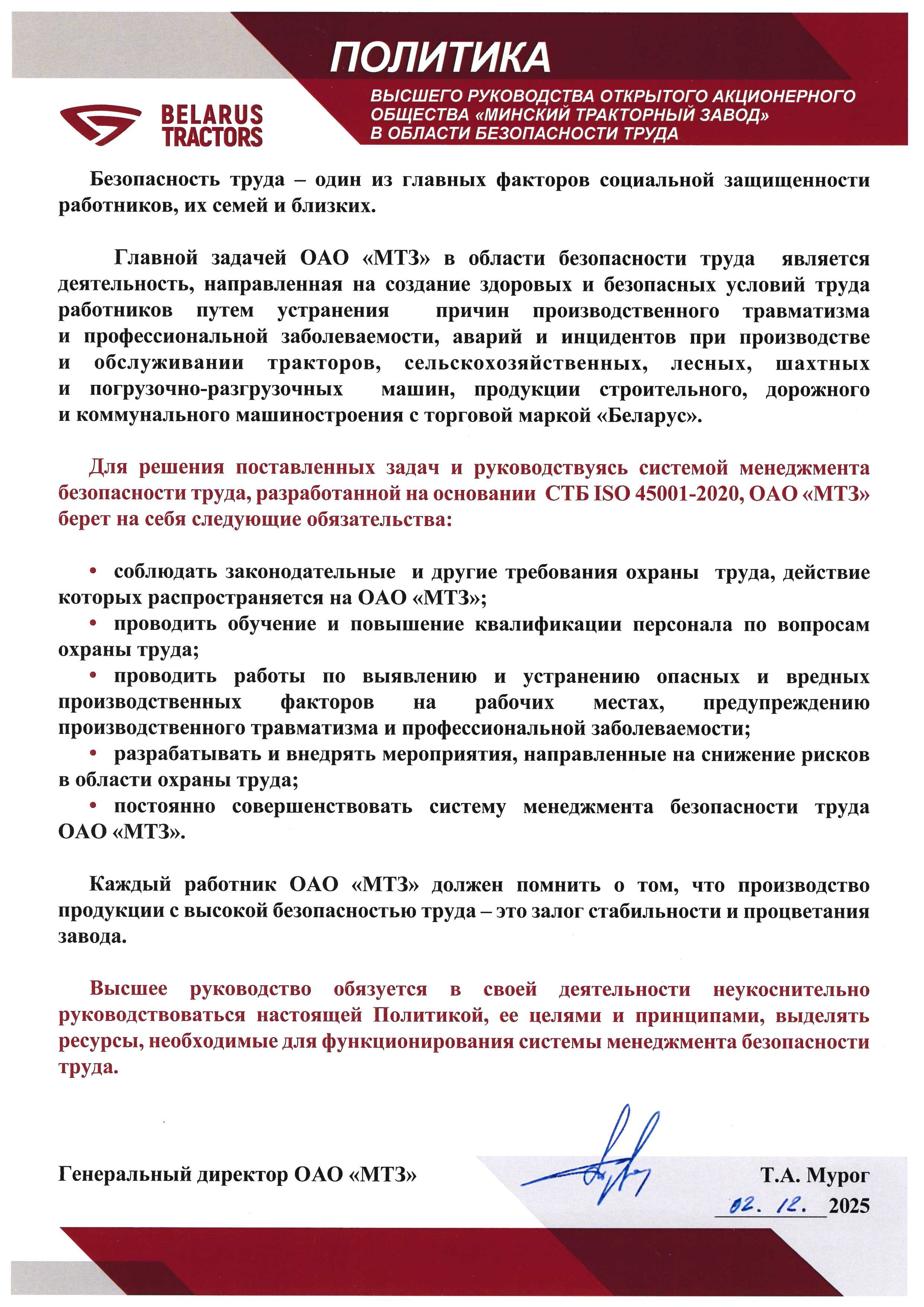Безопасность труда – один из главных факторов социальной защищенности работников предприятия и их семей. Политика высшего руководства ОАО «МТЗ» предполагает создание здоровых и безопасных условий труда путем устранения причин производственного травматизма, возникновения профессиональных заболеваний, аварий и других инцидентов.